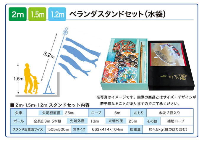ポール全長:2.3m スタンド設置面:505×500mmセット内容:黒鯉1.5m 赤鯉1.2m 青鯉1m 吹流し1.5m 矢車26cm ロープ6m ポール スタンド おもり家紋・名前入れは、別途料金がかかります。